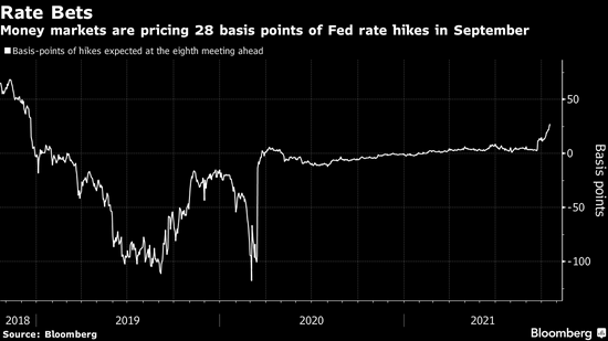 贝莱德策略师预计美联储将如点阵图所示,坚持2023年加息的计划不变。这与货币市场的定价背道而驰。市场认为 ,由于供应链瓶颈、原材料短缺、大宗商品价格居高不下等因素都在刺激通胀,到明年9月前 ,美联储会加息28基点。