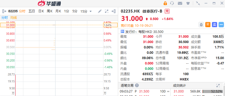 华盛资讯10月19日讯,医械器械企业微泰医疗-B(02235.HK)首挂高开1.64%,不计手续费一手账面浮盈50港元;盘前成交额3309万港元,最新总市值超131亿港元。