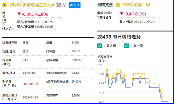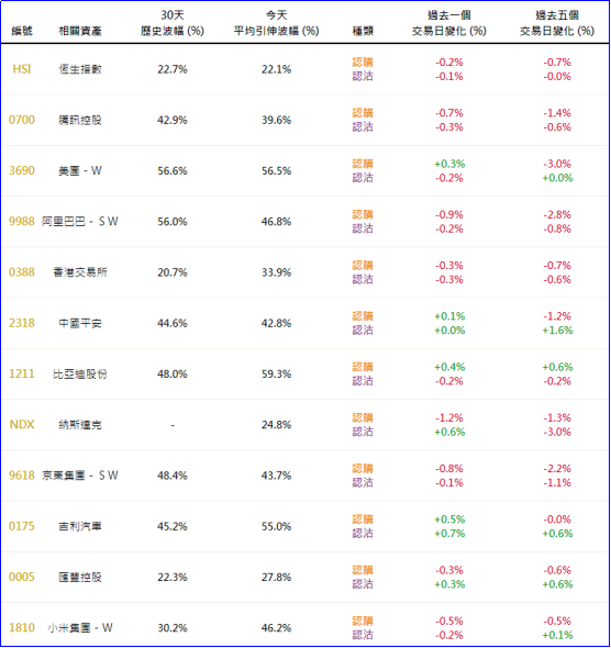 周一恒指相关权证的平均引伸波幅报约22.1%,按日小幅下降。个股方面,腾讯控股、阿里巴巴、香港交易所、京东集团、小米集团等相关权证的引伸波幅均按日下调;美团、中国平安、比亚迪股份、吉利汽车等相关认购证的引伸波幅则按日有所调升。