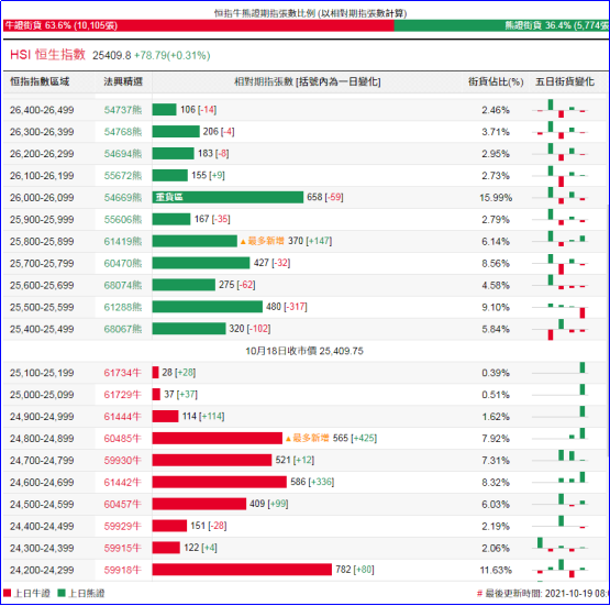 街货分布方面,至周一,恒指牛证街货在收回价24500点至25200点之间,累计相当约2260张期指合约;恒指熊证街货在收回价25400点至26100点之间,按日减少相当约2697张期指合约。