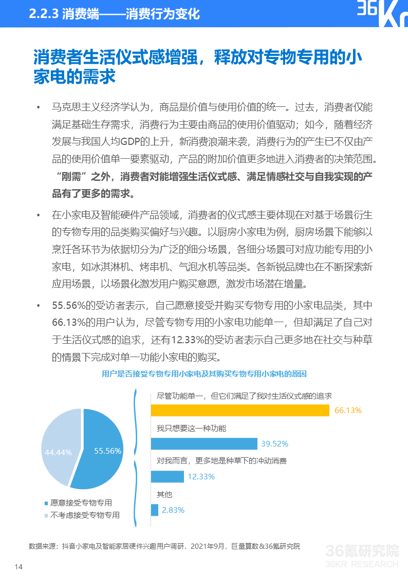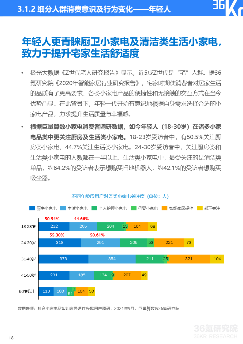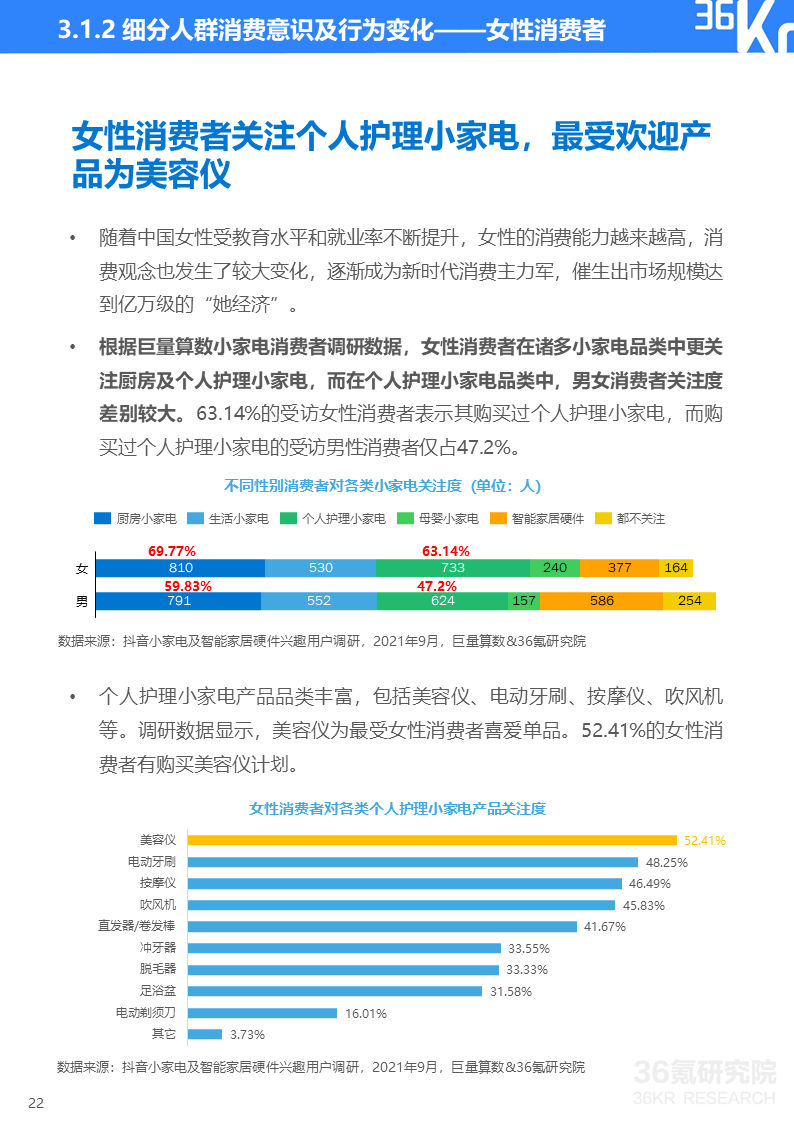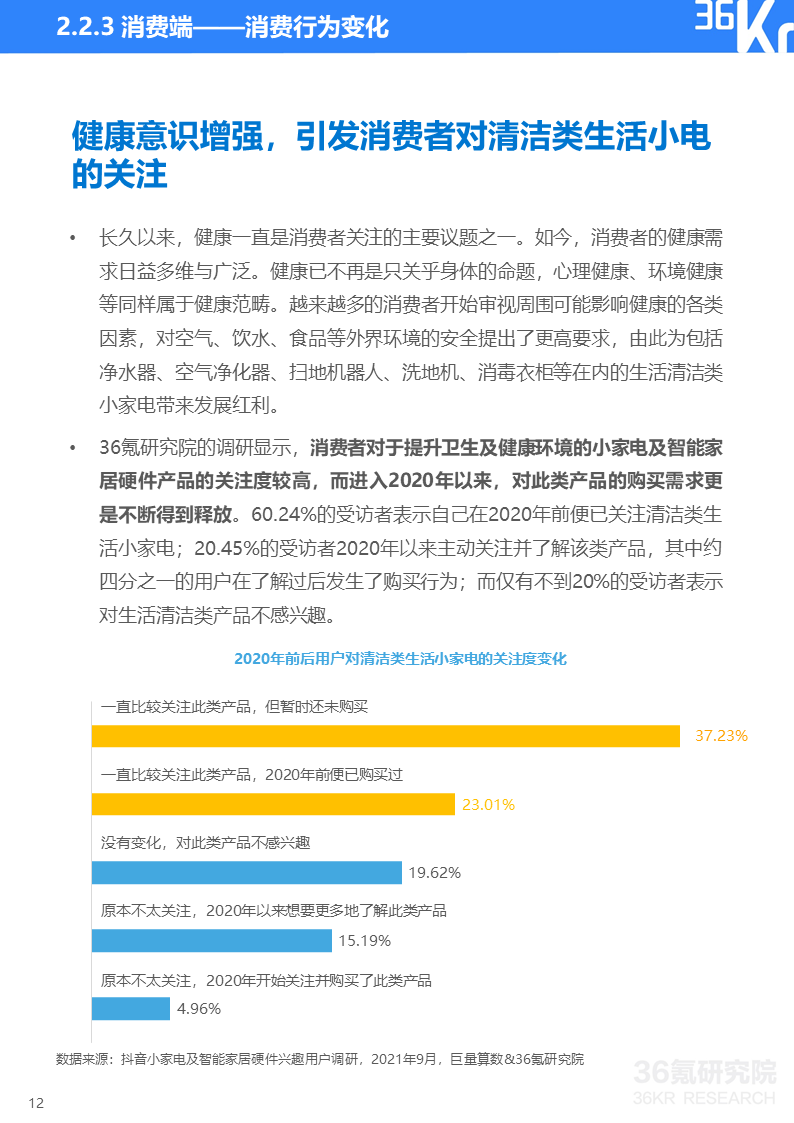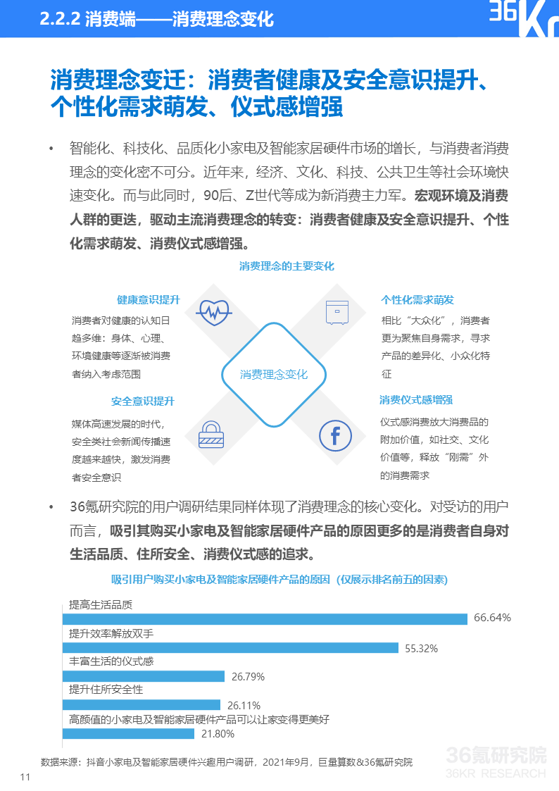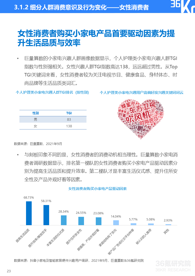 巨量算数&36氪研究院消费者调研显示,如今小家电消费者健康意识增强、安全防范意识觉醒、个性化需求更趋多元并且生活更有仪式感。这些消费理念的变化使得消费者对能即时带来幸福感的小家电及智能设备整体呈现消费升级趋势。