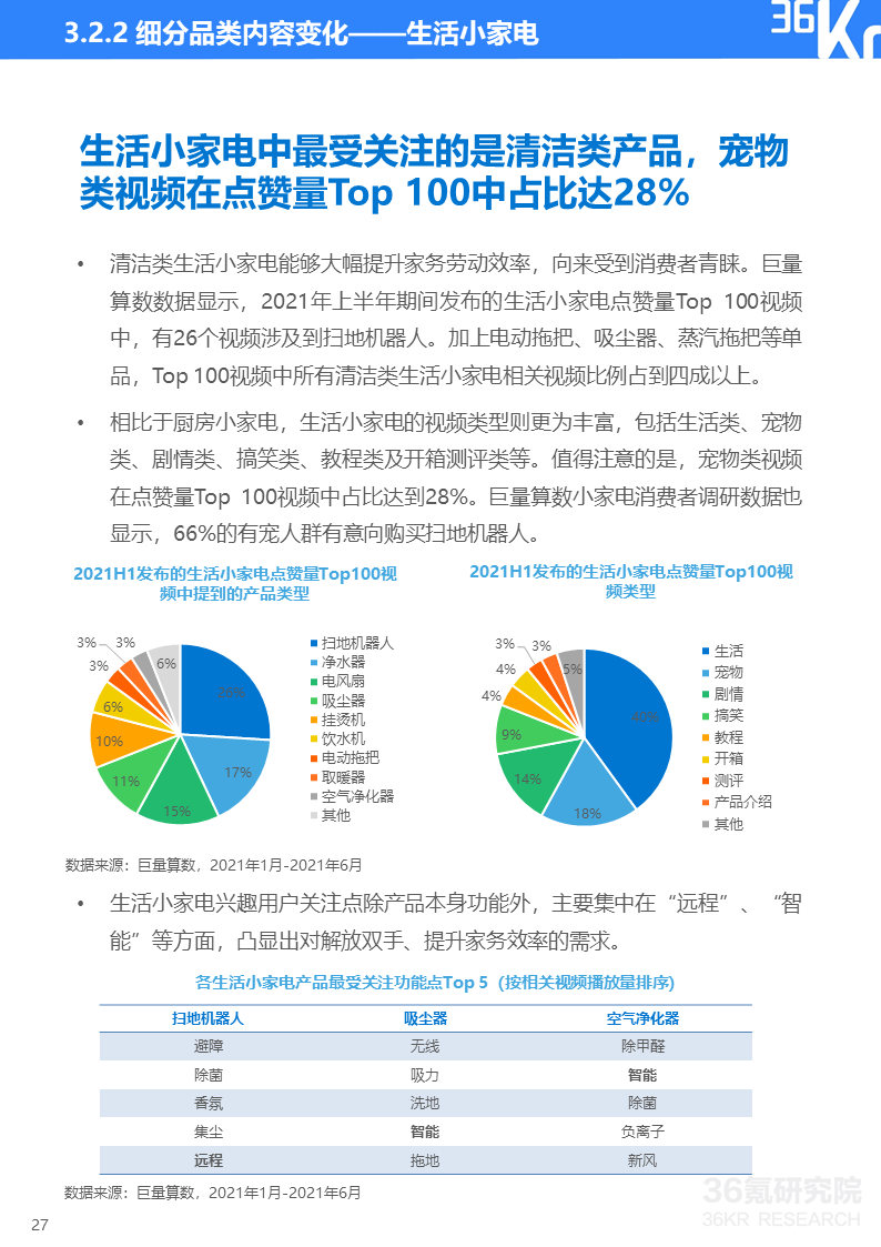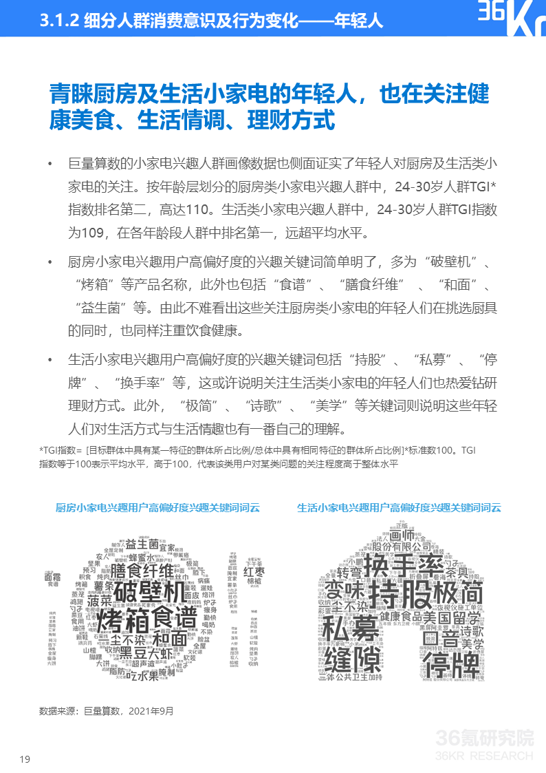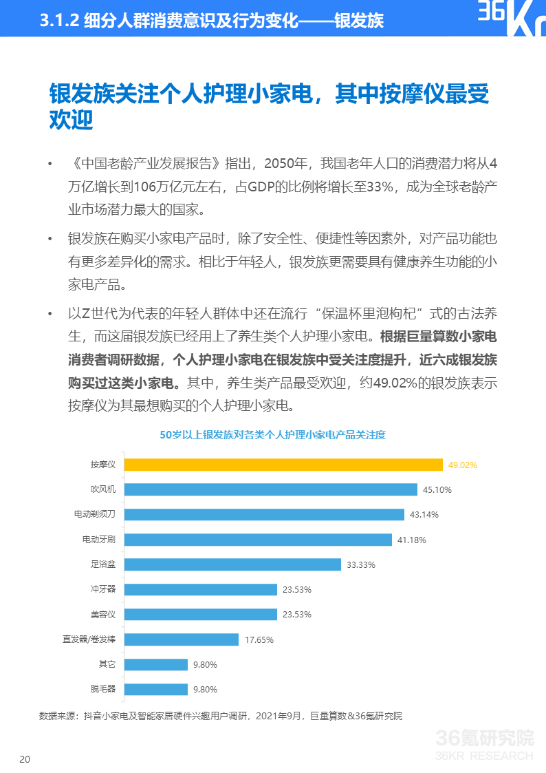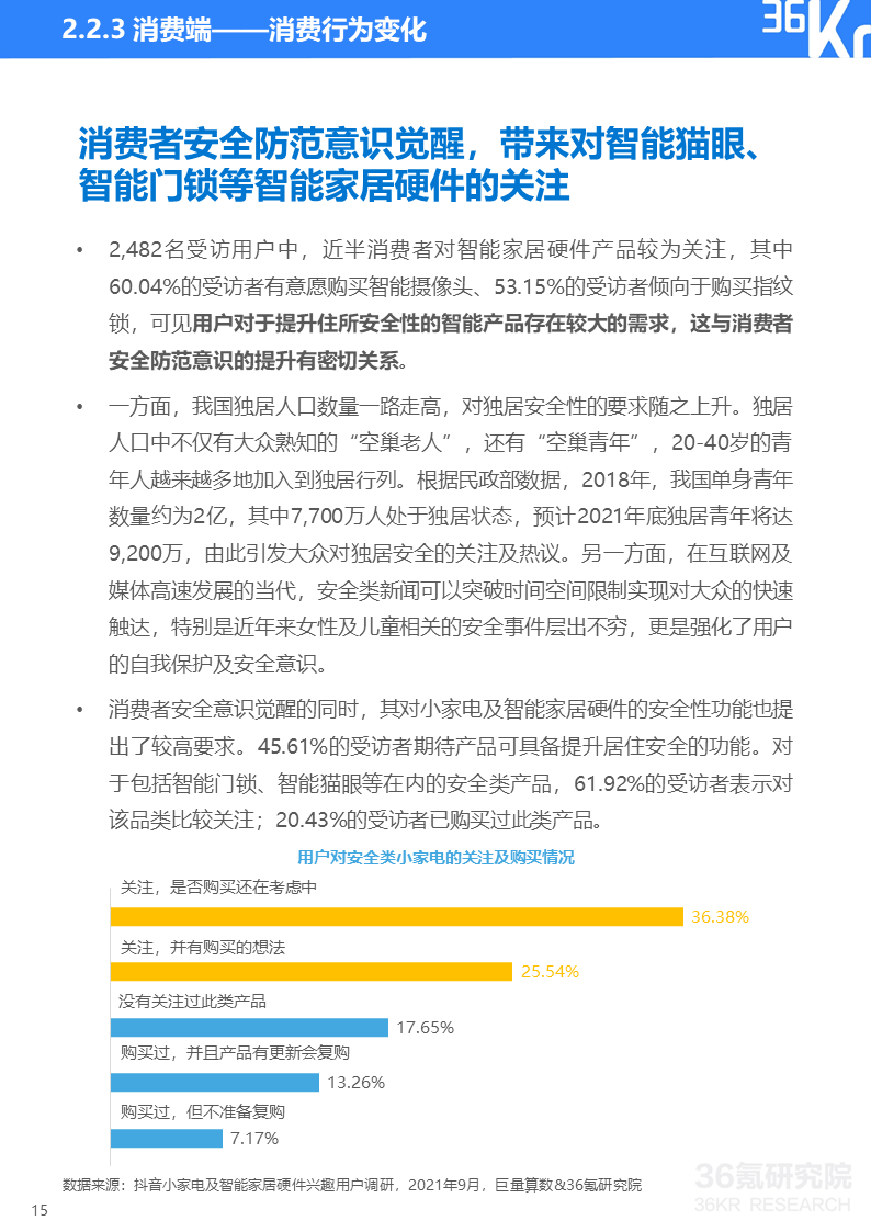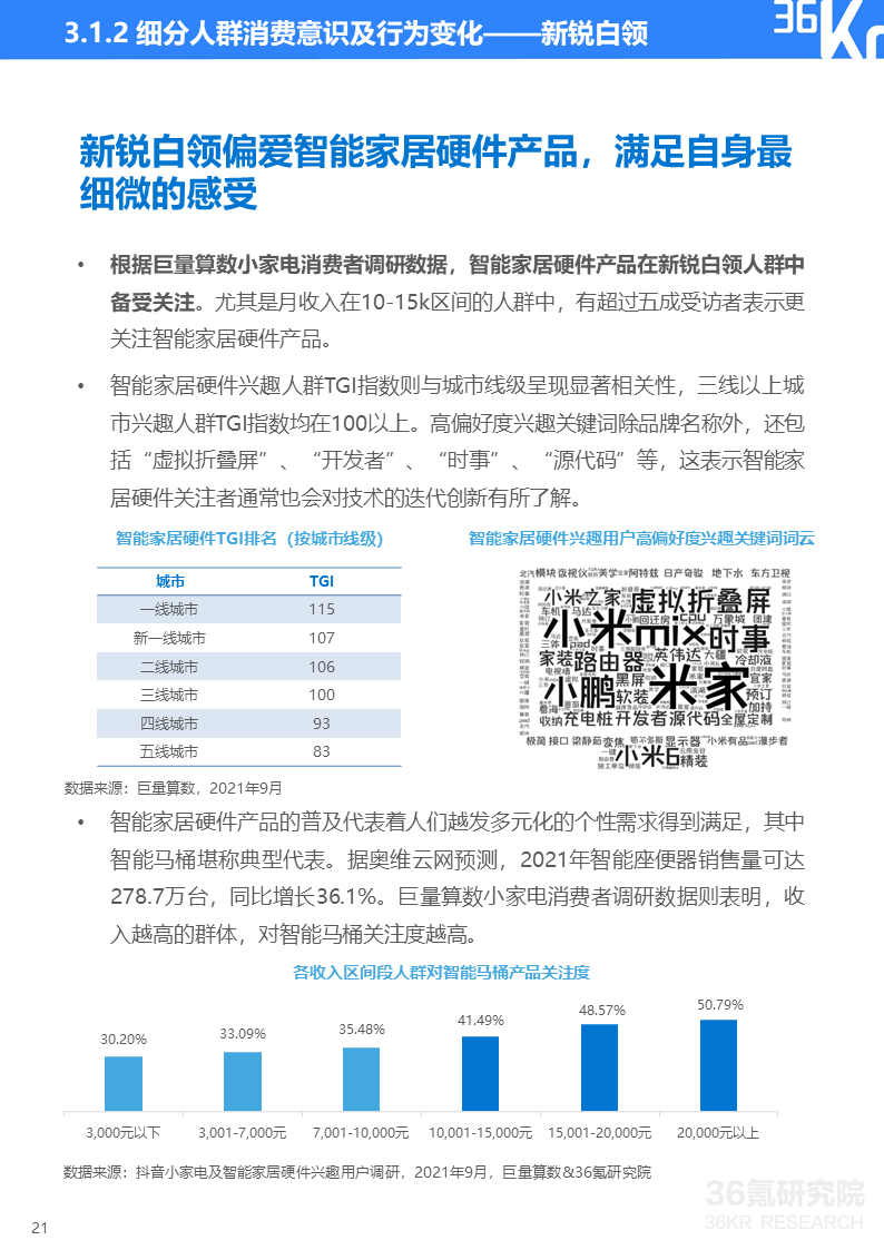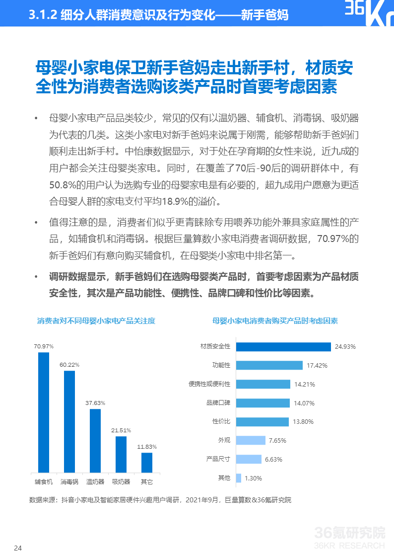 巨量算数&36氪研究院消费者调研显示,如今小家电消费者健康意识增强、安全防范意识觉醒、个性化需求更趋多元并且生活更有仪式感。这些消费理念的变化使得消费者对能即时带来幸福感的小家电及智能设备整体呈现消费升级趋势。