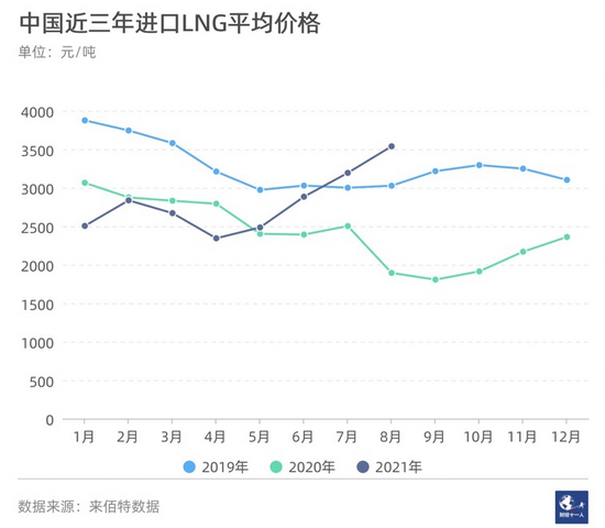 整体来看,今年5月以来进口LNG的平均价格已超过去年同期。此后一路上扬,在7月超过了2019年的同期水平。天然气咨询公司来佰特数据统计显示,8月进口LNG的平均价达到3539元/吨,直逼2019年1月的最高点。