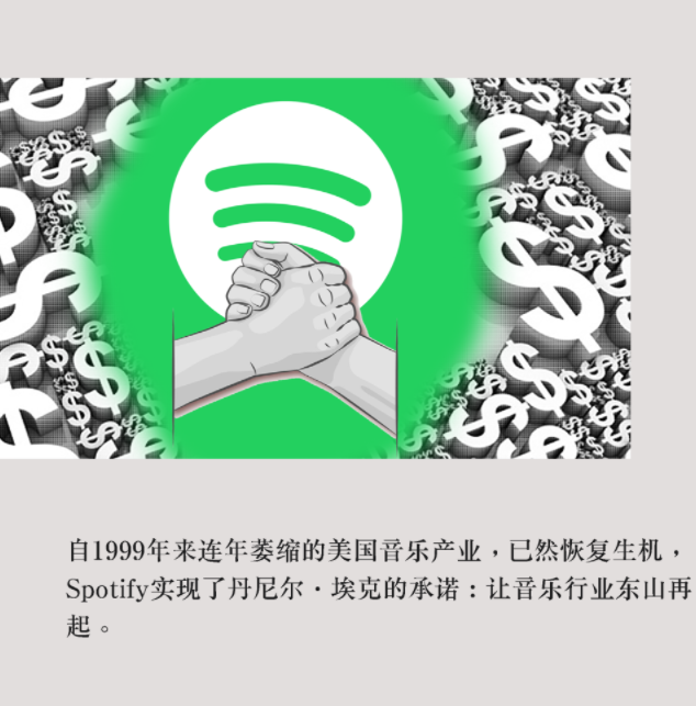 到2016年Spotify创立10周年之际,已拥有3000万名付费用户,几乎是Apple Music的三倍。流媒体服务已经成为美国音乐产业最大的收入来源。这个自1999年来连年萎缩的产业,已然恢复生机,Spotify实现了丹尼尔·埃克的承诺:让音乐行业东山再起。