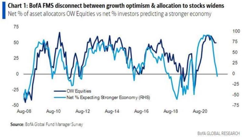 全球利润预期也已转为负数,降至2020年5月以来的最低水平,企业利润率将继续恶化——净51%的经理人预计会出现这种情况。美国银行表示,这意味着增持大宗商品和银行股,减持债券、新兴市场和公用事业股,这些资产被认为容易受到加息的影响。