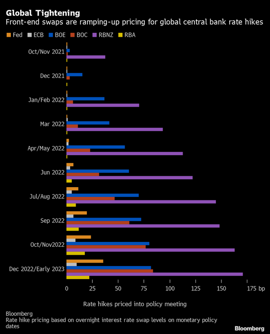 除欧洲央行外,其他央行大多数料将以更快速度加息,与其相比市场对美联储加息的预期算不上激进。美国交易员目前预期美联储将在明年9月政策会议上加息25个基点。而利率掉期市场定价显示,预计届时新西兰央行已经加息五次,加拿大央行三次,英国央行四次。