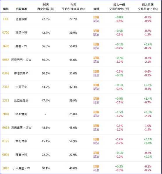 周二恒指相关权证的平均引伸波幅报约22.7%,按日小幅调升。个股方面,腾讯控股、阿里巴巴、比亚迪股份、美团等相关认购证的引伸波幅按日上升;腾讯、美团、阿里巴巴、中国平安、京东集团、吉利汽车等相关认沽证的引伸波幅则按日下降。