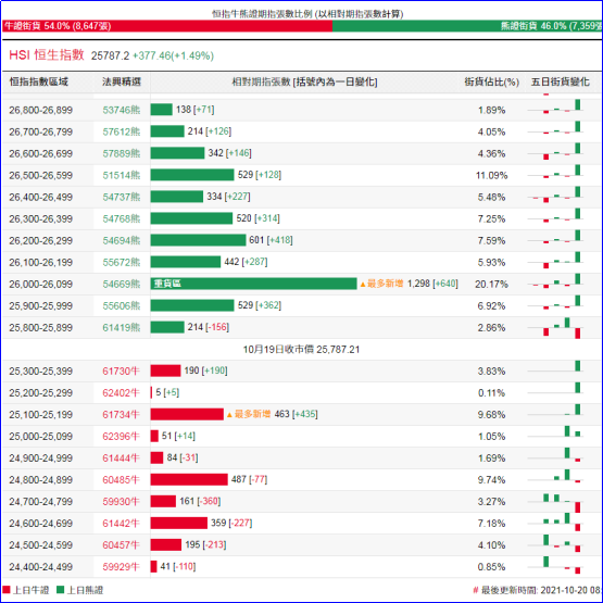 街货分布方面,至周二,恒指牛证街货在收回价24600点至25400点之间,累计相当约1800张期指合约;恒指熊证街货在收回价25800点至26300点之间,相当约3084张期指合约。