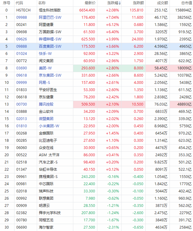 盘面上,科网股普涨。阿里巴巴涨7.04%,报176.4港元每股,成交额46.17亿港元;哔哩哔哩涨3.99%;百度、快手等涨逾3%;美团涨2.8%;网易涨2.61%;互联网医疗股阿里健康涨6.12%;腾讯、小米跟涨。