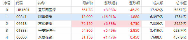 华盛资讯10月20日消息,互联网医疗股今日全线走高,阿里健康盘中劲升16.91%,京东健康、平安好医生涨超5%,众安在线涨超1%。