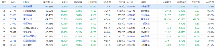 中煤能源A股跌停,H股跌5.3%;中国神华A股跌6.35%,H股跌2.8%。