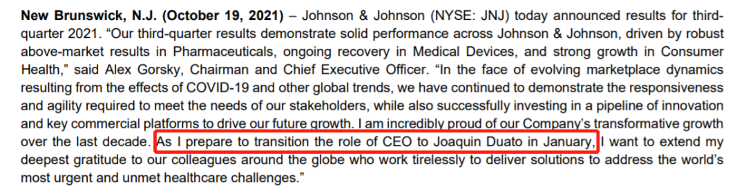 此前在8月19日,担任强生CEO近10年的Gorsky宣布卸任,将由其长期副手Duato于2022年1月3日接棒。