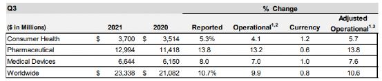 2021年Q3,制药业务仍是强生主力板块,营收129.94亿美元,同比+13.2%。