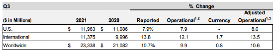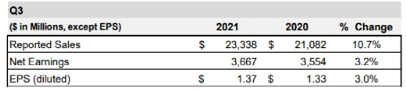 2021年Q3财报显示,强生全球营收为233.38亿美元,同比+10.7%。每股收益1.37美元,增长3.0%。