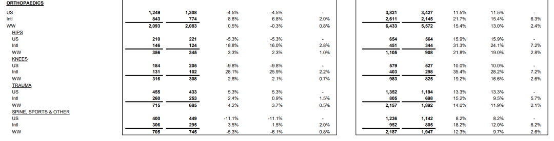 (骨科髋关节:营收3.56亿美元,同比+2.3%;膝关节:营收3.16亿美元,同比+2.1%;创伤:营收7.15亿美元,同比+3.7%,主要增长来自美国;脊柱&其他:营收7.05亿美元,同比-6.3%)