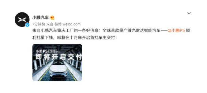 小鹏汽车消息,全球首款量产激光雷达智能汽车小鹏P5顺利批量下线,即将在十月底开启首批车主交付。