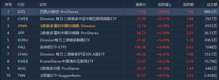 从ETF涨幅榜来看,每日二倍做多中证中国互联网指数ETF $CWEB 涨8.31%,成交额2927万美元;3倍做多富时中国50指数ETF $YINN 涨8.24%,成交额6555万美元。