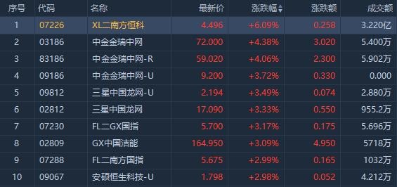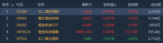 南方两倍做多恒科 $07226.HK 涨6.09%,成交额为3.22亿港元;