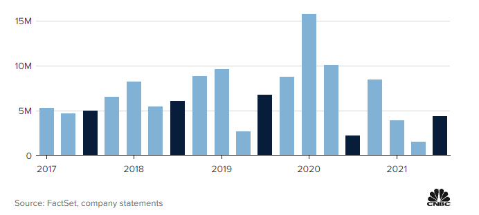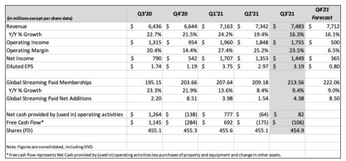 第三季度,奈飞营收74.83亿美元,同比增长16.3%;净利润为14.49亿美元,上年同期为7.9亿美元;摊薄后每股收益3.19美元,此前Refinitiv统计的分析师预期为2.56美元;订阅用户增长440万,远超分析公司StreetAccount预期的384万。