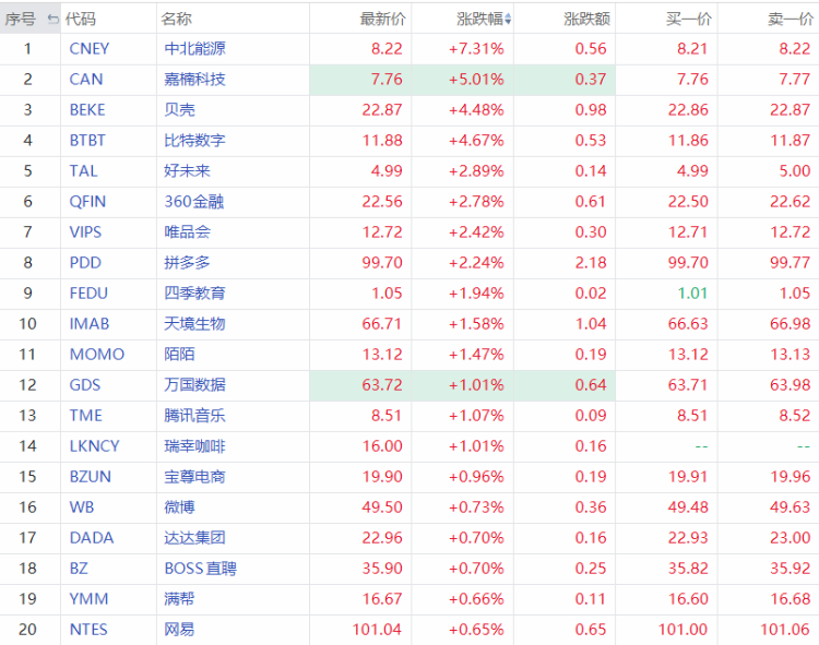 华盛资讯10月20日讯,今日开盘,热门中概股多数上涨,其中中北能源(CNEY)涨7.31%,嘉楠科技(CAN)涨5.01%,比特数字(BTBT)涨4.67%,万国数据(GDS)涨1.01%。