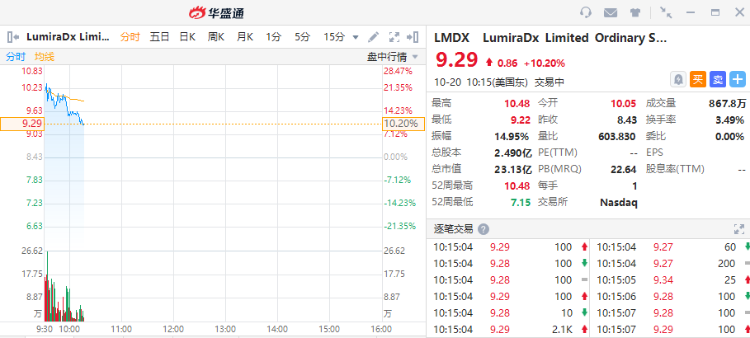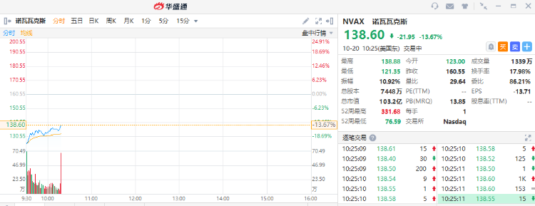 华盛资讯10月20日讯,美股开盘,疫苗股诺瓦瓦克斯(NVAX)跌幅收窄至13%,盘前一度大跌27%。截至发稿,该股成交额达17.45亿美元,位居美股成交额第六位;而LumiraDx(LMDX)涨超10%,盘前一度大涨39%,消息称印度授权LumiraDx新冠抗原检测紧急使用。