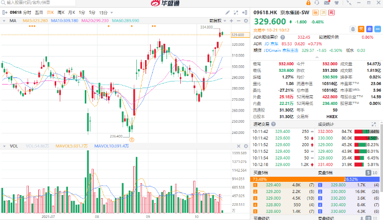受利好消息影响,近期京东港股价格持续拉升,20日盘中高见报334.8港元/股,创半年多以来新高。