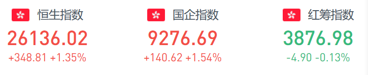 截至周三收盘,恒生指数涨1.35%,报26136.02点,国企指数涨1.54%,红筹指数跌0.13%。恒生科技指数涨2.65%,阿里健康涨超13%,阿里涨6.67%,哔哩哔哩涨6.40%,百度涨4.61%。