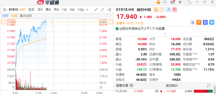 华盛资讯10月21日消息,港股内房股普涨,融创中国、旭辉控股集团涨超8%,中国奥园涨超7%,龙湖集团、时代中国控股涨超6%,世茂集团、新城发展、雅居乐集团涨超5%。