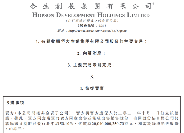 合生创展还在公告中表示,根据协议,若因一方违反协议致使要约无法落实,非违约方有权终止协议,且违约方须向非违约方支付违约金10亿港元。