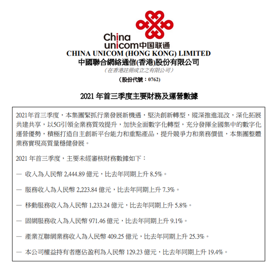 10月21日消息,中国联通在港交所公告,2021年首三季度,收入为2444.89亿元,比去年同期上升8.5%;公司权益持有者应占盈利为129.23亿元,比去年同期上升19.4%。