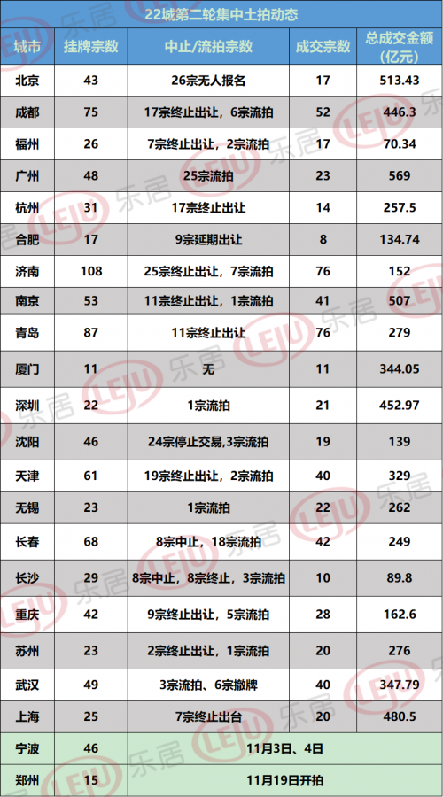 截至10月20日,除郑州、宁波外,22城中已有20城完成第二轮土地集中供应。各地本轮土拍中,延期、终止挂牌、流拍频繁出现,交易结果颇为惨淡,与数月前首轮供地的火热景象形成鲜明对比。