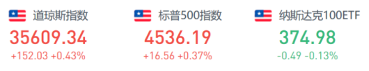 截至周三收盘,道指涨152.03点,或0.43%,报35609.34点;纳指跌7.41点,或0.05%,报15121.68点;标普500指数涨16.56点,或0.37%,报4536.19点。