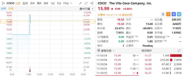 华盛资讯10月21日消息,美国椰子饮料生产商椰子水品牌Vita Coco(COCO)今日登陆纳斯达克,开盘涨超6%,现报15.99美元,市值达1.839亿美元。