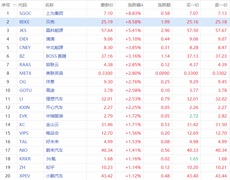截至发稿,上为集团(SGOC)涨8.83%,贝壳(BEKE)涨8.58%,瑞幸咖啡(LKNCY)涨0.94%,嘉楠科技(CAN)跌4.93%,新东方教育跌4.00%。