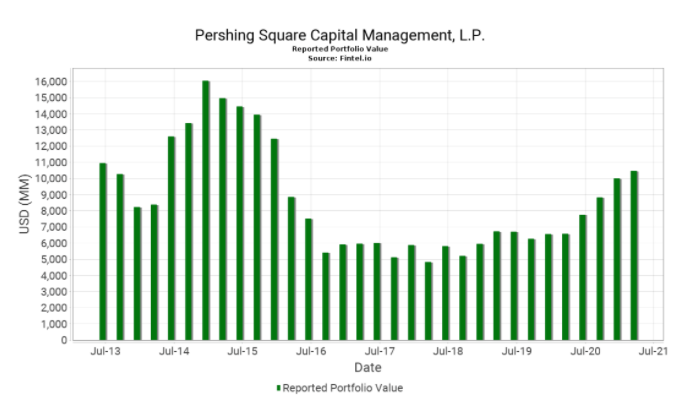 根据13F数据,截至2021年Q1,潘兴广场的管理规模接近105亿美元。