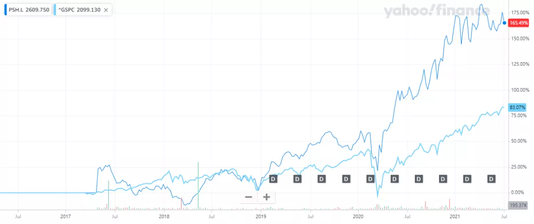 以伦交所的价格为例,PSH自2017年上市以来的收益为165.49%,大幅跑赢了标普500。