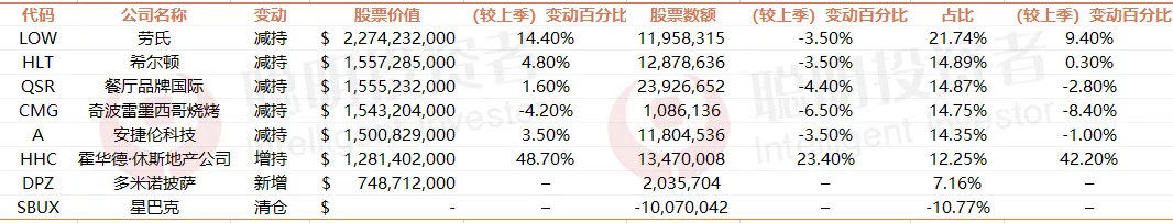 一季度,潘兴广场新增了对多米诺披萨的投资,并增持了霍华德·休斯(一家位于德克萨斯州的房地产开发和管理公司),同时放弃了星巴克。