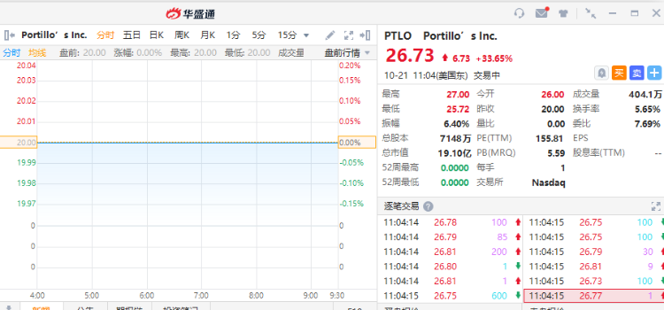 华盛资讯10月21日消息,美国知名连锁餐厅Portillo's登陆美股,开盘涨超30%。截至发稿,该股涨33.65%,股价报26.73美元,此前招股价区间为17至20美元。