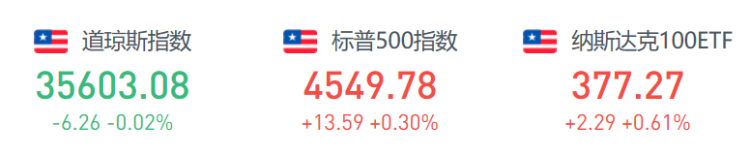 截至周四收盘,道指跌6.26点,或0.02%,报35603.08点;纳指涨94.02点,或0.62%,报15215.70点;标普500指数涨13.59点,或0.30%,报4549.78点。