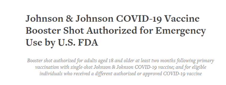 强生公司(JNJ)宣布,美国食品和药物管理局(FDA)已经签发了强生新冠疫苗增强剂的紧急使用授权(EUA):18岁及以上的成年人,在初次接种单针强生新冠疫苗后至少两个月后,以及接种其他种类疫苗的符合条件的患者,可以接种强生新冠疫苗的增强剂。据悉强生增强剂的配方和剂量将与主剂相同。