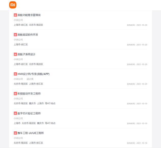 此前,小米曾在招聘网站发布消息,招聘囊括整车设计研发多个岗位,大到汽车底盘、整车架构,小到空调、内饰,一应俱全,而工作地点包括“上海徐汇”。 10月22日,澎湃新闻记者查询小米官网显示,包括汽车数字模型设计、座舱功能安全开发等系列造车岗位仍在招聘中,工作地点依旧包括上海徐汇。