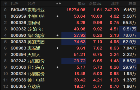 伴随着“双11”预售的启动和业绩保障,今日,家电股普涨。小熊电器、澳柯大涨10%封板,苏泊尔盘中也一度涨停,海尔智家涨超8%,美的集团、惠而浦、火星人等个股跟涨。