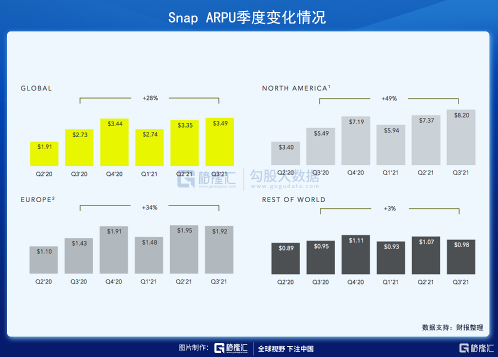 Snap的DAU增长仍然稳健,全球来看有23%的同比增速。不过拆分来看北美和欧洲的增速已明显放缓,基本见顶,增量主要来源于海外。这里涉及到另外一个问题,海外的变现能力相比欧美差距比较大。