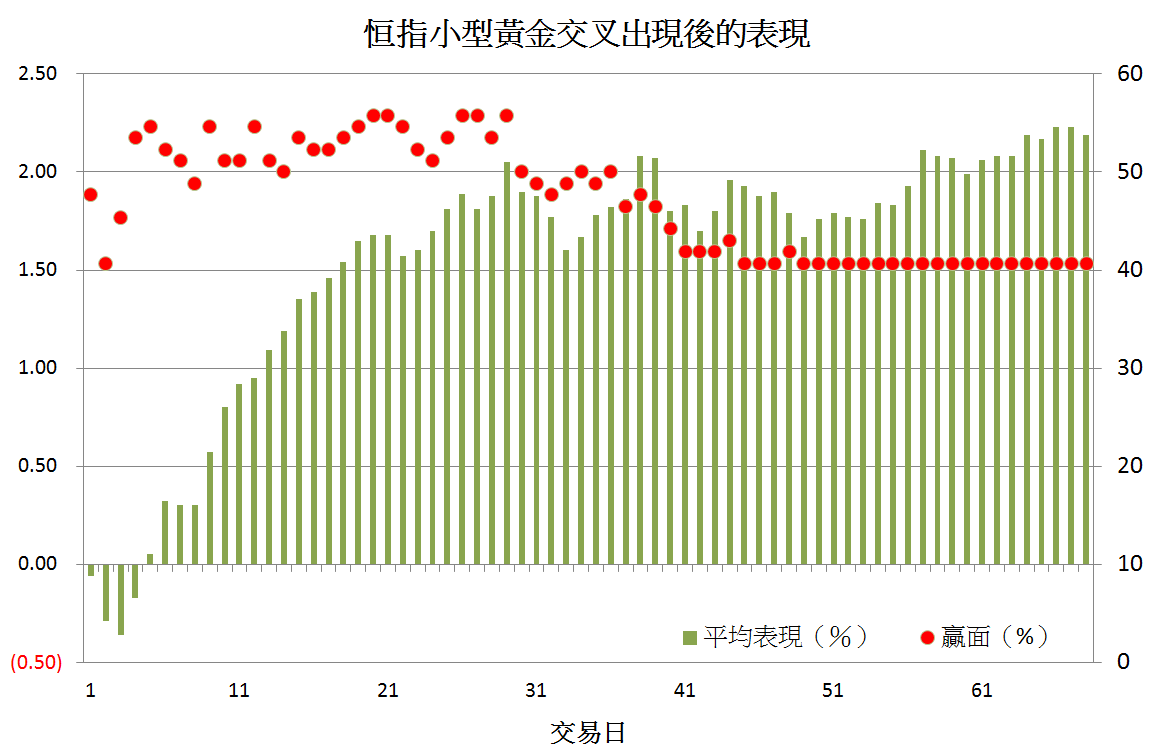 从附图2可见,若按这策略操作,在过去30年首5个交易日的平均表现,录得0.1%至0.4%的平均跌幅;反而,在第6个交易日后开始平均表现持续回升,并且延续至约25个交易日才在约2%左右水平喘稳。换言之,根据backtest结果显示,恒指发出黄金交叉讯号后,投资者可等待至第5个交易日后才入市,并且持仓约一个月时沽出,这或许可以获得较佳的回报。不过,同样要留意的是,这策略的赢面一般只是稍高于50%而已。不过,纯粹从廻溯测试的平均表现,对指数后市发展的启示,或意味恒指发出黄金交叉讯号后,短期(未来一星期)表现或将会偏软,随后一个月将逐步略为造好。