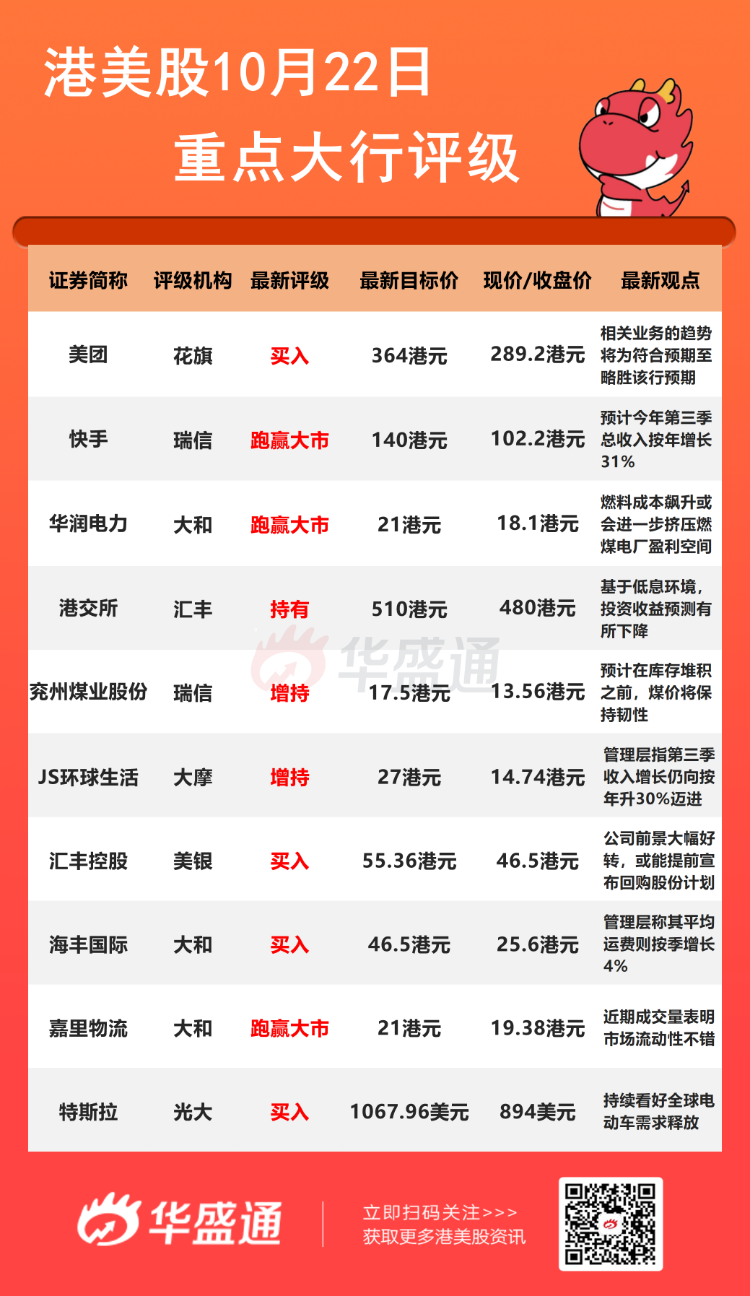 花旗发研报指,美团将于11月底发布第三季度业绩,由于新冠疫情重燃及部份地区水灾影响,管理层对第三季到店及酒店业务,以及外卖订单量看法较为悲观。该行相信,相关业务的趋势将为符合预期至略胜该行预期,另外34.42亿元人民币的罚款亦会于第三季入账,并影响纯利数字,不过非通用会计准则纯利及EBITDA则不受影响。该行维持其买入评级,目标价364港元。该行预计,美团第三季收入按年升36.4%至483亿元人民币,非通用会计准则净亏损为54.5亿元人民币;外卖整体交易额为按年升28.8%至1960元人民币;到店业务收入按年升32%至85.5亿元人民币;新业务收入按年升66%至137亿元人民币。美团第四季业绩将受“十一黄金周”强劲的本地消费所带动,料收入按年升36%至516亿元人民币。