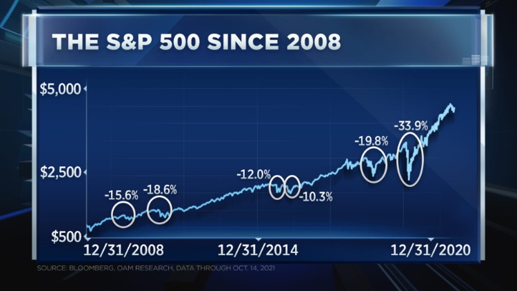 Stoltzfus同时认为,基于2008年后的市场走势,即便股市在这个关头出现大幅下跌投资者也不用害怕,因为下跌意味着机会。他在最近的一份研报中着重强调了一张图表,该表显示标普500指数 $SPX 自2009年3月9日以来一共经历了六次大回调。2009年3月9日正好是那场金融危机的最低点,但同时也是下一轮牛市的开始。此外,去年美股因疫情恐慌单月熔断4次之后,不过用了6个月就再创新高(标普500指数 $SPX ),纳指 $IXIC 只用了4个月。