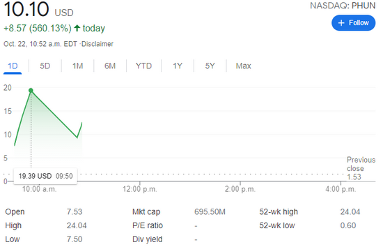 参与特朗普2020年连任竞选的广告软件初创公司Phunware也与DWAC齐头并进。该股周五一度上涨1099%,至16.82美元,本周迄今累计上涨近1700%。
