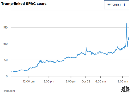 FX168财经报社(北美)讯 周五(10月22日),与美国前总统特朗普相关的SPAC公司数字世界收购公司(Digital World Acquisition Corp.)股价再次飙升。