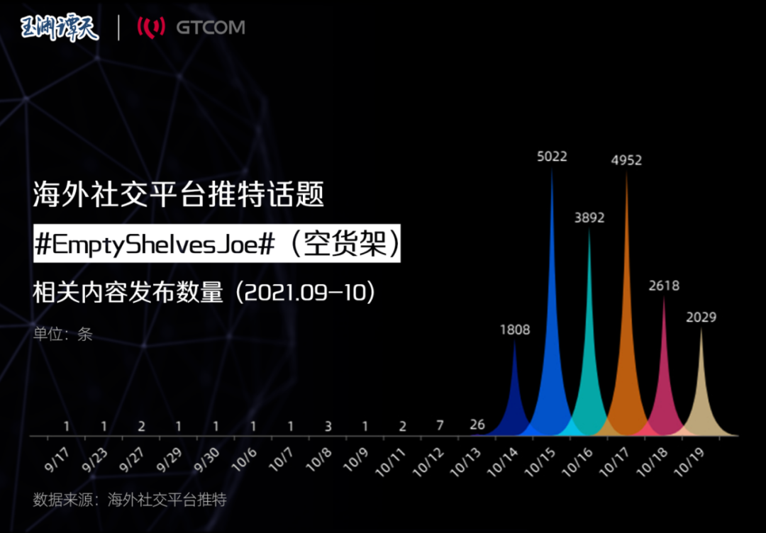 专业机构中译语通通过大数据和知识图谱技术分析发现,10月13日以来,推特上#EmptyShelvesJoe#(空货架)相关话题热度激增。