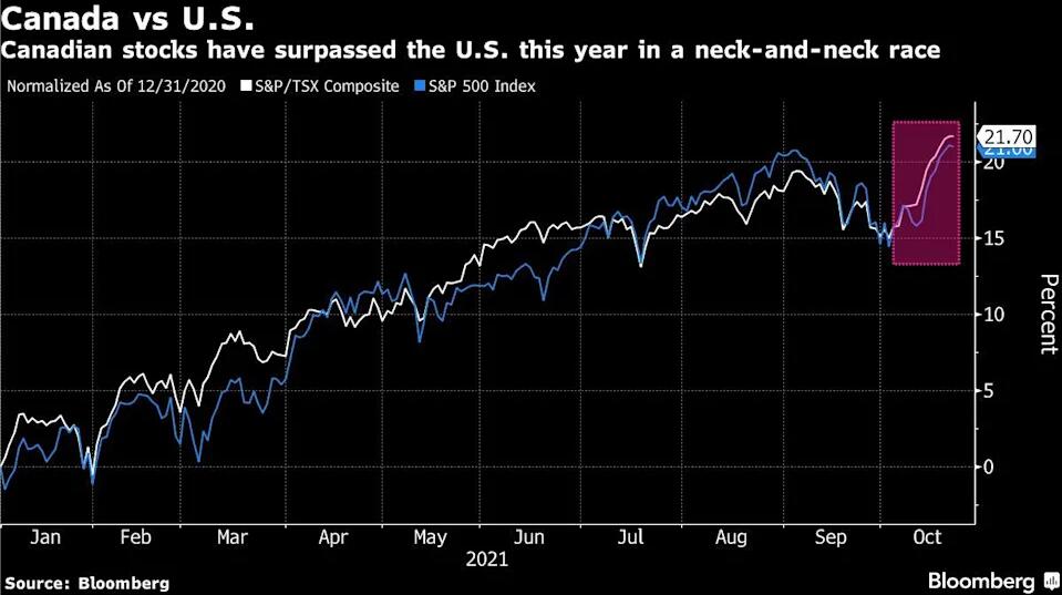 今年迄今,S&P/TSX综合指数已累计飙升了约22%,超过了标普500指数21%的涨幅。